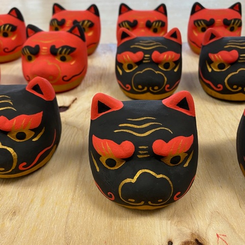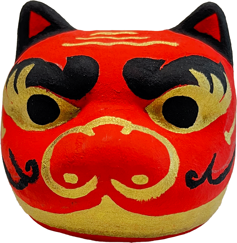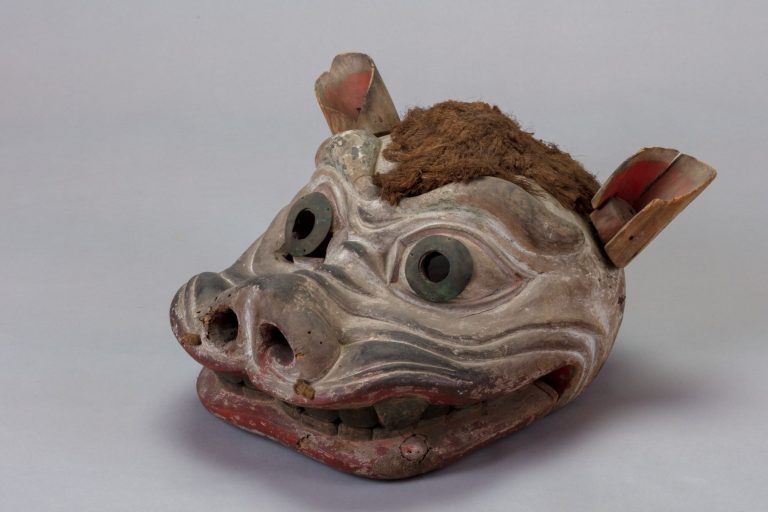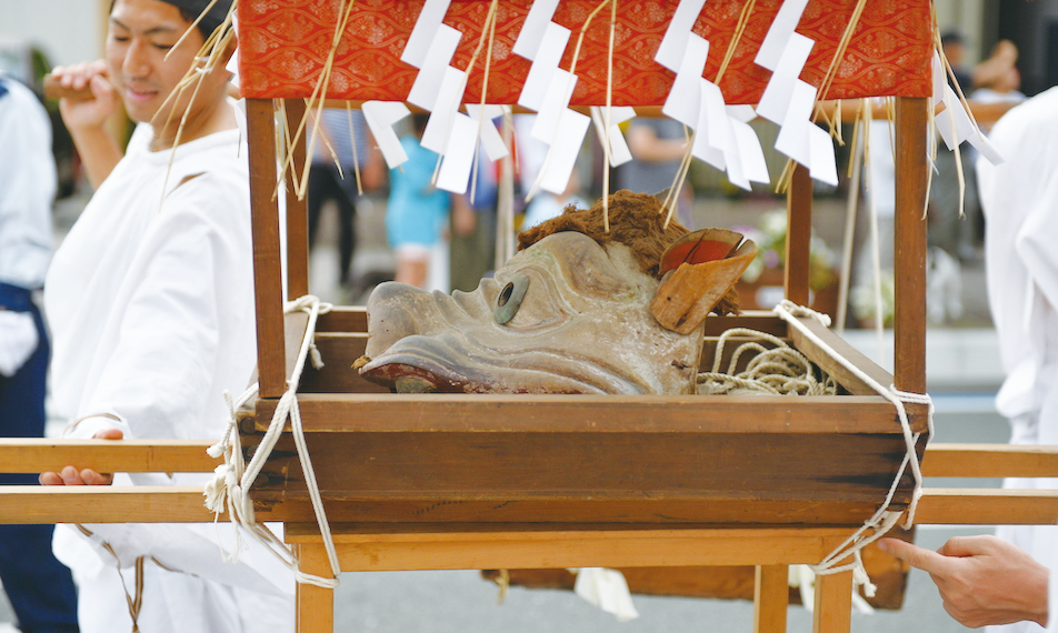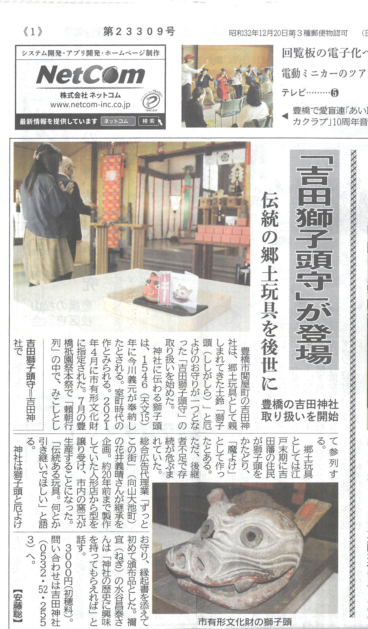 モデルとなった獅子頭(写真)は、今川義元公が吉田城域の神明社(現:吉田神社)に奉納したと伝えられ、現在も祇園祭の神輿渡御(頼朝行列)では神輿の前で常に南を向き同行しています。 ※モデルとなった獅子頭は豊橋市有形文化財